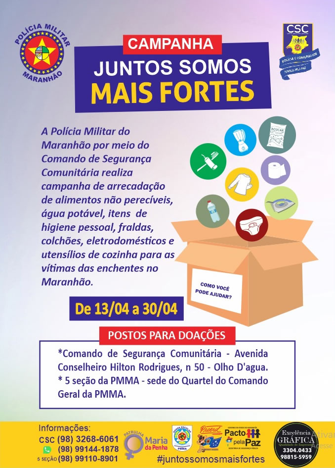 Polícia Militar por meio do Comando de Segurança Comunitária realiza campanha solidária às vítimas de enchente no Maranhão.