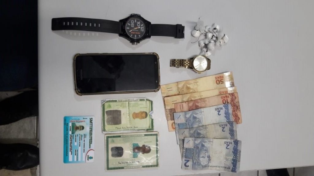 Segundo os militares, a guarnição avistou a dupla em atitude suspeita. Durante a revista pessoal, os policiais localizaram com eles dez invólucros de substâncias semelhante à cocaína, além de joias, um aparelho de celular e 116 reais em espécie.