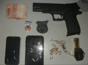 Através de denúncia anônima, os policiais militares do 13º BPM receberam a informação de que havia um homem armado, ameaçando outras pessoas em uma festa localizada na Rua Santa Bárbara no bairro Pau Deitado em São José de Ribamar. De imediato, as viaturas de serviço na área deslocaram para o local e constataram a veracidade dos fatos, o suspeito ainda tentou se evadir do local com a ajuda de outro comparsa mas ambos foram detidos. Daniel Oliveira dos Santos Soares, 23 anos, e Danilo de Almeida Santos, 22 anos, receberam voz de prisão e foram apresentados na Delegacia do Maiobão juntamente com o simulacro de arma de fogo e a motocicleta que seria utilizada por eles.