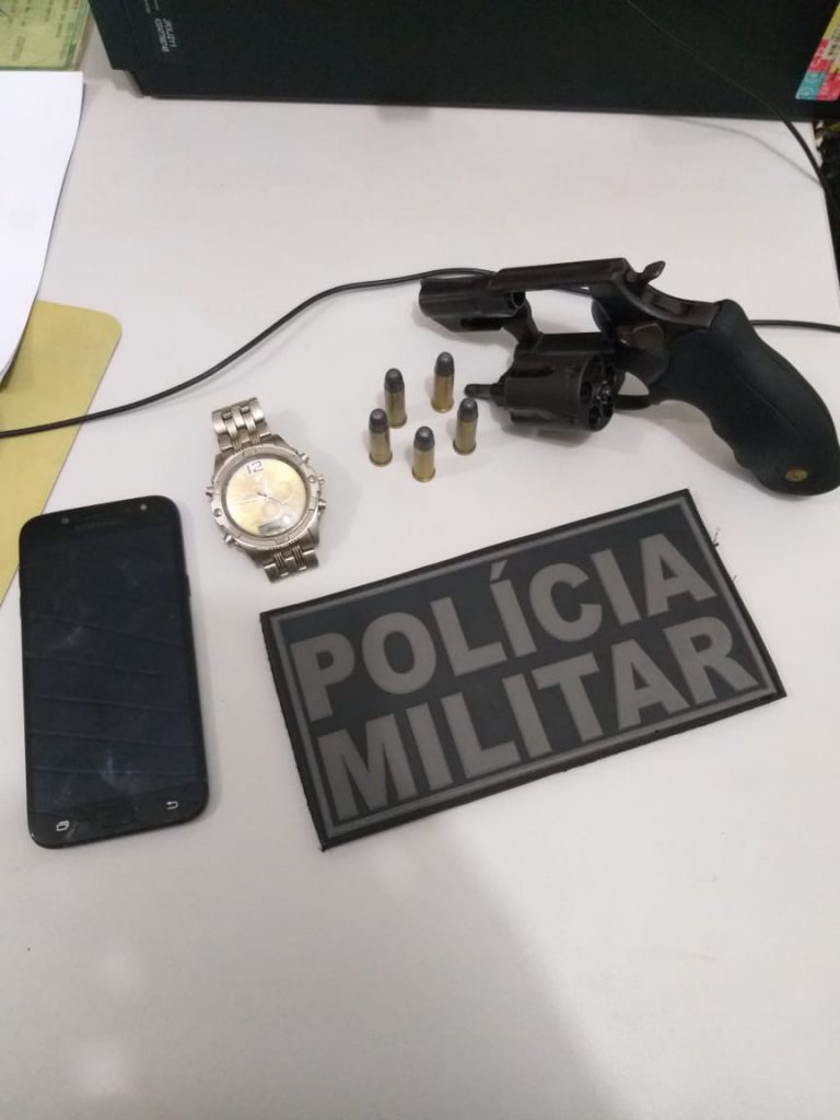 A guarnição realizava rondas ostensivas na região quando observaram dois indivíduos em atitude suspeita, durante a busca pessoal encontraram junto aos homens um revólver calibre 38 com cinco munições, um celular e um relógio de pulso.