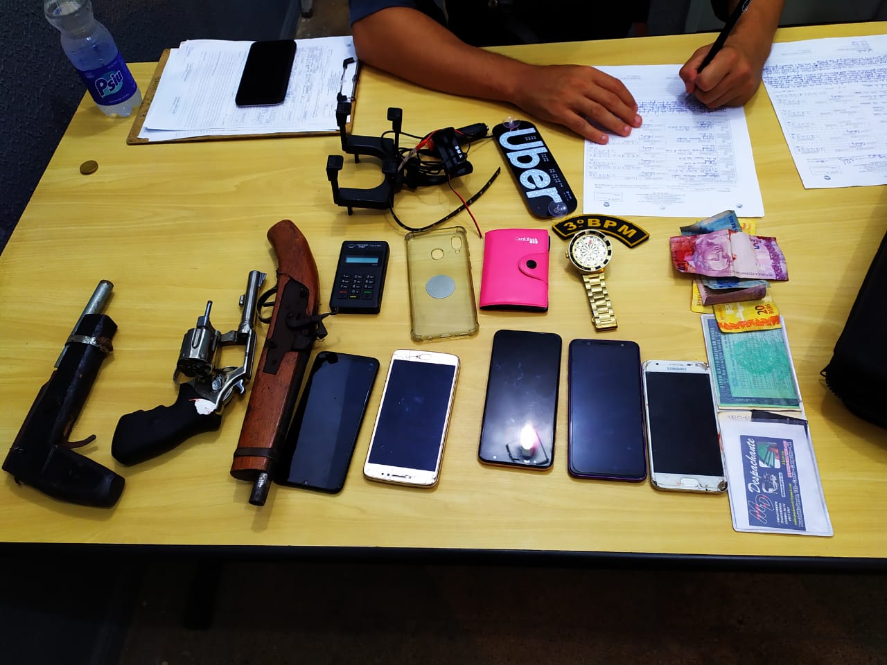 Um bloqueio foi montado pelos policiais do 3º BPM, Grupo de Operações Especiais (GOE) e Cavalaria para visualizar os acusados. Ao identificarem os suspeitos, os militares seguiram em acompanhamento tático. Após tentativas de fuga os criminosos foram capturados, com eles foram encontrados os celulares, demais objetos pessoais das vítimas e 03 (três) armas de fogo.
