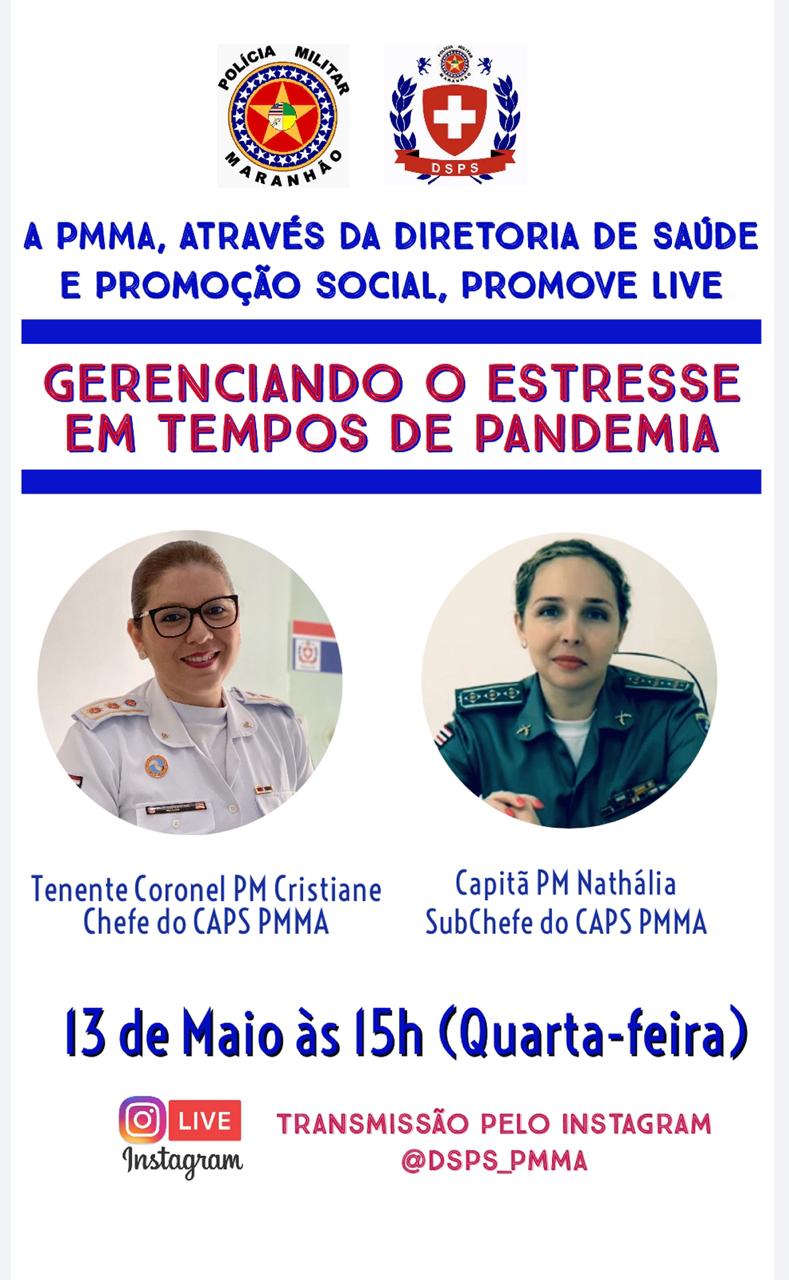 A Diretoria de Saúde e Promoção Social, por meio do CAPS da PMMA, realizará uma live no dia 13/05 às 15hs pelo Instagram @dsps_pmma com o tema: Gerenciando o Estresse em Tempos de Pandemia.