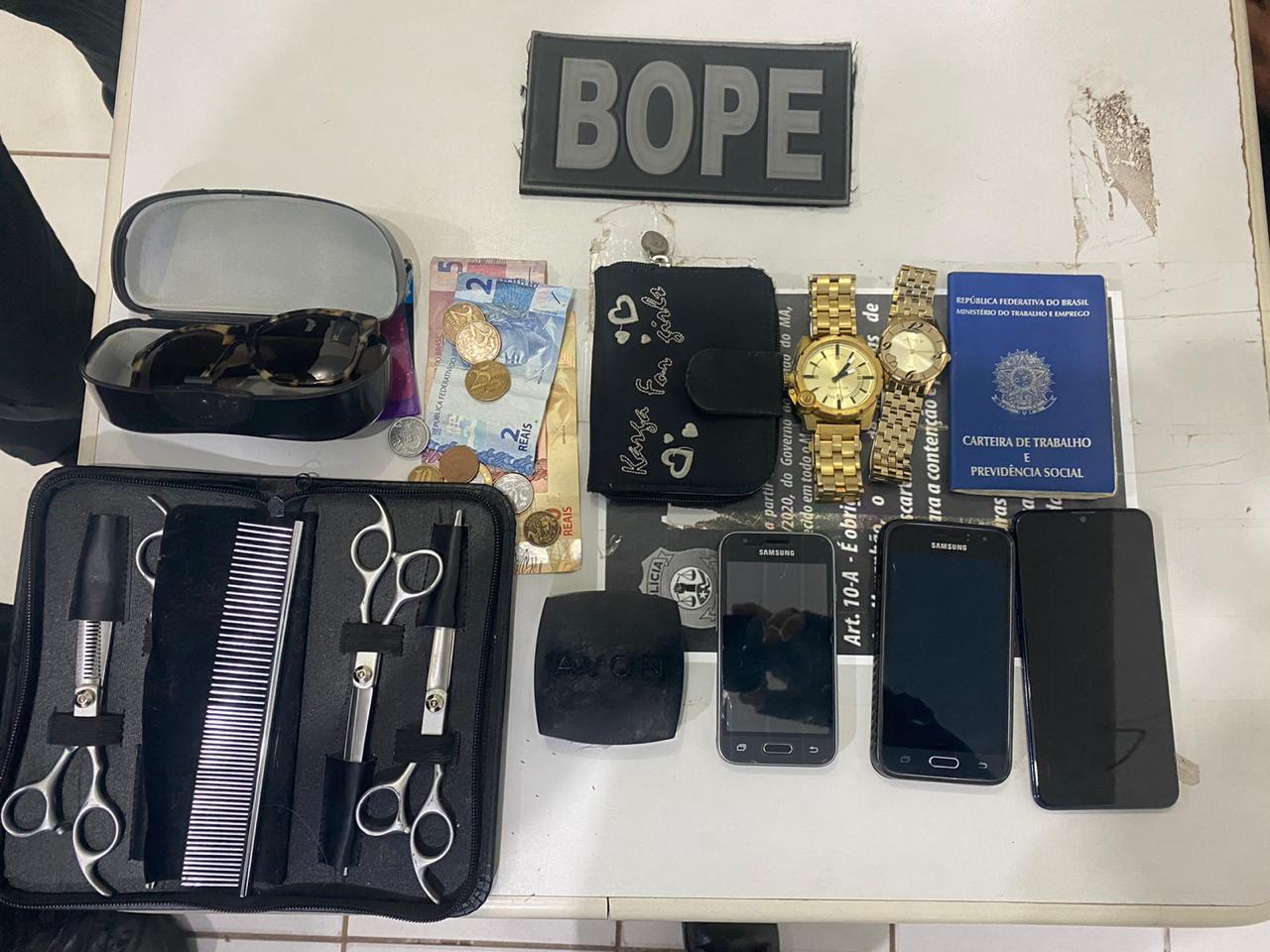 As equipes fizeram o cerco e conseguiram apreender dois menores envolvidos no assalto com objetos das vítimas. Os mesmos foram reconhecidos pelas vítimas e apreendidos com três celulares da marca Samsung, dois relógios dourados, um óculos de sol, um kit de tosa para cachorro, duas bolsas femininas, uma mochila preta e R$ 70,00 (setenta reais).