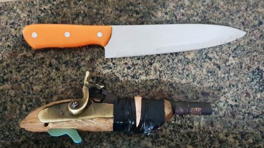 Segundo os militares, a guarnição de serviço foi informada que um homem estava tentando arrombar uma residência e ameaçando a vítima com uma arma de fogo. Os policiais foram até o local informado e ao chegar o suspeito empreendeu fuga. Foi realizado um cerco policial logrando na captura do acusado. Com ele a PM apreendeu uma com a arma de fogo e uma arma branca (faca).