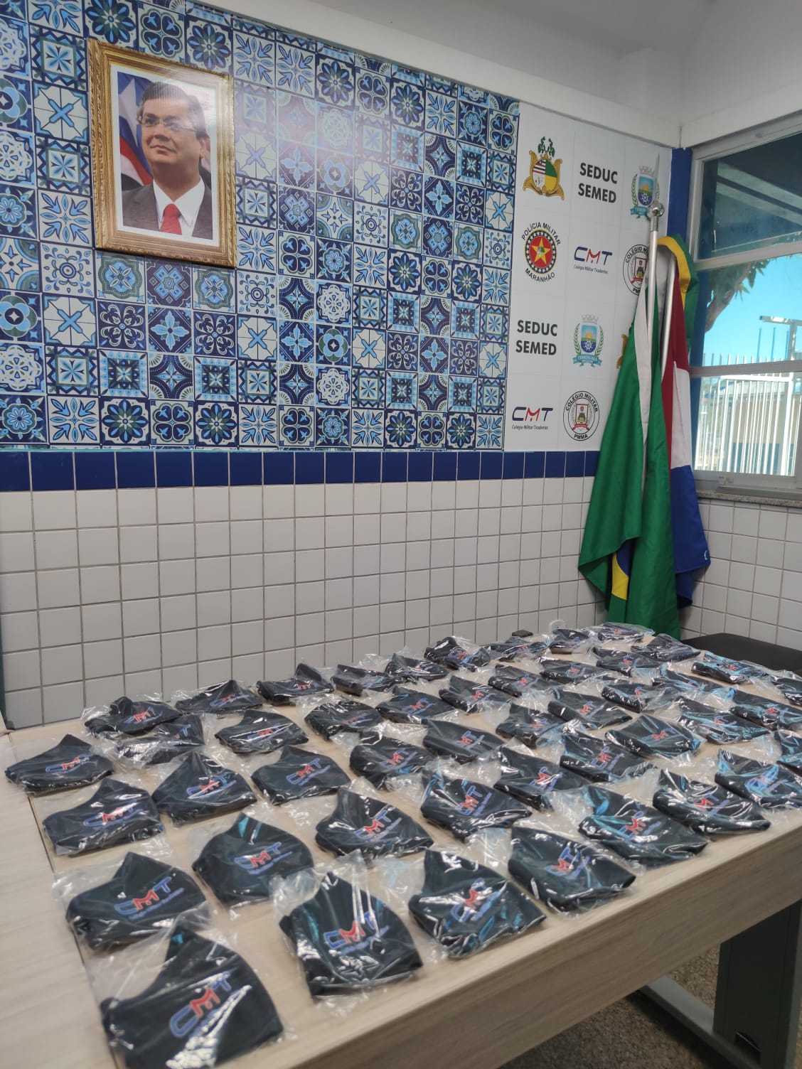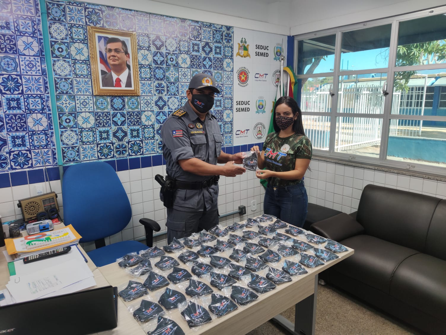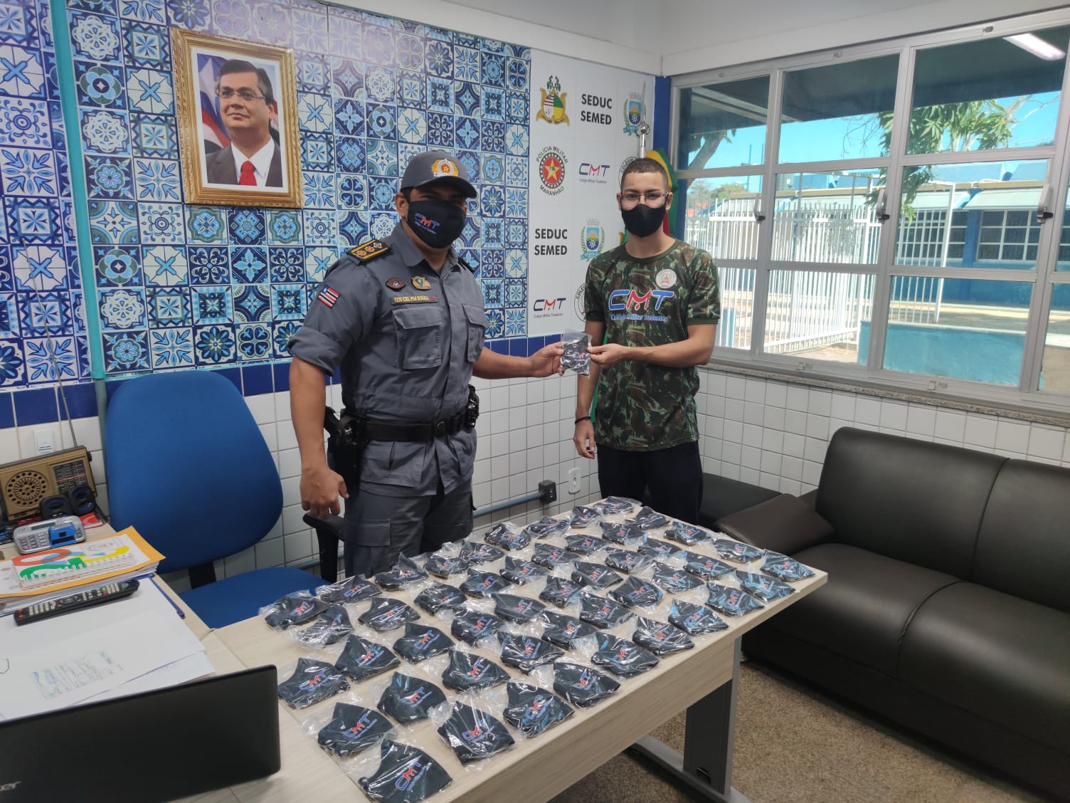 Neste dia 18 de agosto, o Comando do Colégio Militar Tiradentes V faz entrega de máscaras personalizadas de tecido aos Policiais Militares e pessoal do pedagógico e administrativo que estão trabalhando presencialmente. A medida, aliada ao uso diário de um aparelho aferidor de temperatura corporal, higienização constante da escola, inclusive com lavagem do prédio e sanitização com produtos químicos eficazes e recomendados, além de disponibilização de álcool em gel em todas as dependências e principais pontos de circulação, fazem parte das medidas adotadas pelo Colégio Militar da PMMA em Timon-Ma para o combate à disseminação da Covid-19, causada pelo novo Coronavirus.
