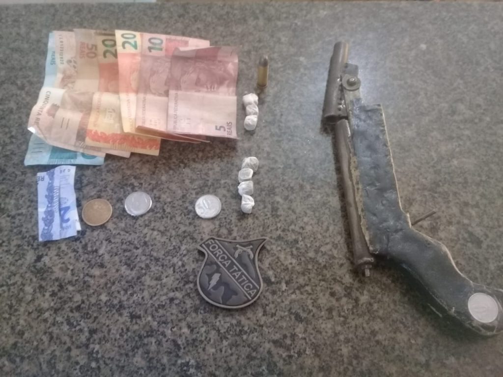 Ao realizarem busca pessoal no suspeito os policiais ainda encontraram 6 porções de uma substância aparentando ser maconha, e outra parte da droga estava no chão.  Foi encontrada ainda a quantia de R $ 258,25, sendo que o mesmo não soube dizer ao certo à quantia que tinha.
