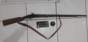 A guarnição imediatamente foi ao local e encontrando o agressor fez a abordagem; na busca pessoal foi encontrado uma arma faca em cintura e em sua posse uma espingarda bate-bucha e uma motocicleta.