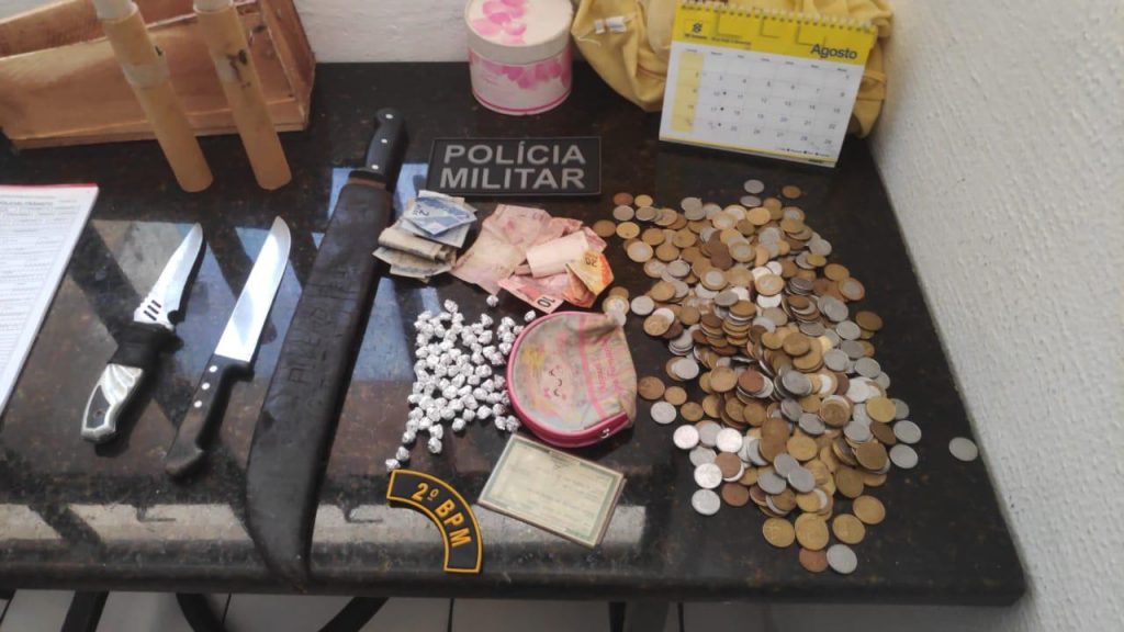 Os policiais da Radiopatrulha da 3ª Cia do 2º BPM prenderam um suspeito de tráfico de drogas quando avistaram uma movimentação de veículo suspeita na Rua D, no Bairro Sarney, na cidade de Coelho Neto – MA. Os policiais realizaram a abordagem e nas buscas foram encontrado setenta e quatro papelotes de substancia semelhante à crack; um punhal; um facão; uma porta moedas contendo a quantia de R$ 60,00 reais e um cofre contendo R$ 150,40 em dinheiro.
