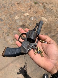 Dois indivíduos em atitude suspeita, ao perceberem que a guarnição policial se aproximava, empreenderam fuga. Em ato contínuo, os militares fizeram o acompanhamento tático e capturaram os indivíduos. Durante a revista pessoal, foi encontrado um revólver calibre 22, com seis munições, sendo uma deflagrada e cinco intactas, e seis aparelhos celulares.
