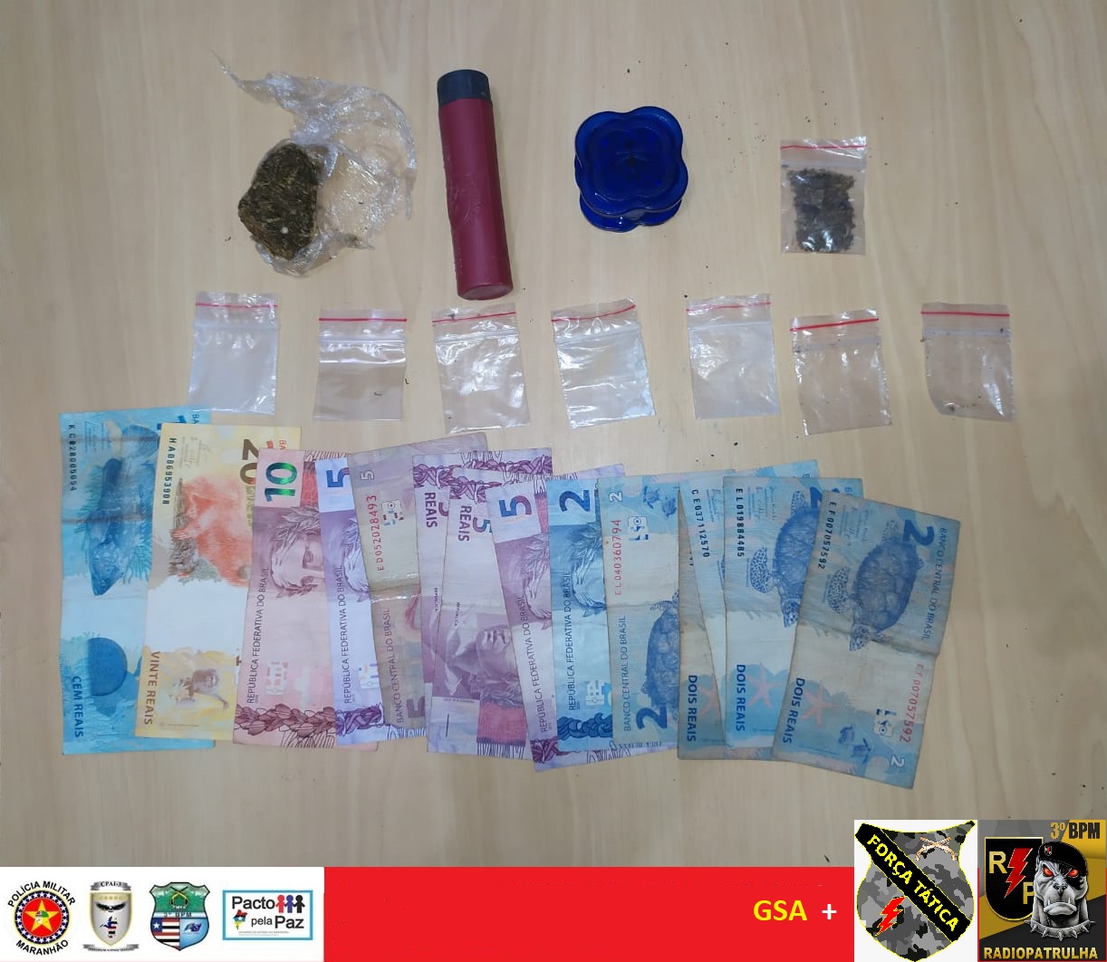 Nesta última sexta-feira (18), Policiais Militares foram acionados pelo Centro Integrado de Operações de Segurança (CIOPS) sobre denúncia de dois indivíduos suspeitos que estavam em ônibus que seguia com destino a cidade de Governador Edson Lobão. Após abordagem, foi encontrada em posse dos suspeitos uma certa quantidade de substância semelhante à maconha. Questionados, os homens informaram o endereço onde adquiriram a suposta droga. As guarnições seguiram ao local indicado, encontrando os suspeitos sentados em frente à residência. Os indivíduos foram revistados, momento este que foi encontrado em posse de um dos acusados uma quantidade de substância semelhante à maconha. Este por sua vez confessou aos policiais que a droga lhe pertencia. Os indivíduos foram conduzidos e apresentados à Delegacia de Polícia Civil. Dentre os materiais apresentados estavam: 01 (um) tablete semelhante a maconha;04 (quatro) sachês semelhantes a maconha, 02 (dois) celulares, a quantia de de R$ 167,00 (cento e sessenta e sete reais) em espécie; embalagens de distribuição; 01 (um) moedor de maconha e 01 (uma) porção de pólvora.