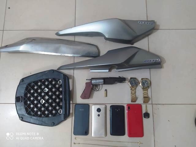 Com eles foram apreendidos uma arma de fogo tipo garrucha, calibre 38, carregado com uma munição do mesmo calibre, quatro aparelhos celulares, dois relógios e partes da carenagem de uma motocicleta cor prata, também tomada de assalto, porém já recuperada.