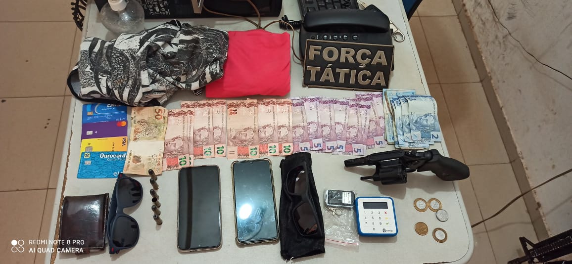 Com os suspeitos foram apreendido, quatro cartões, dois óculos, um revólver Taurus calibre 38, seis munições, dois celulares sendo um Samsung e um Motorola, um porta cédula, um Chevrolet Onix de cor branca, placa QQW-3346, uma máquina de cartão Samup e R$ 201,75 (duzentos e um reais e setenta e cinco centavos).