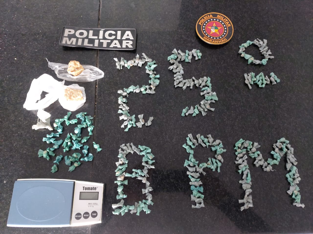 Com os suspeitos foram apreendidos, cento e noventa e cinco reais cabeças de uma substância similar a crack, duas pedras de uma substancia similar a crack de aproximadamente 20 g, uma balança de precisão, uma porta cédulas com documentos pessoais, uma mochila preta, R$ 4,00 (quatro reais).