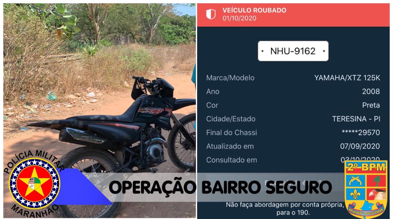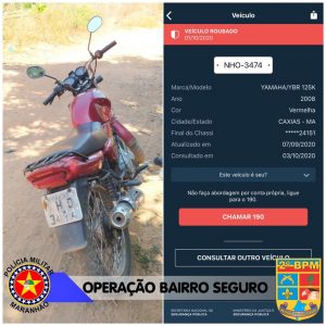Na manhã desse sábado (03), a Polícia Militar recuperou três motocicleta roubadas durante a Operação Bairro Seguro em Caxias-MA. Por volta das 07h30, a Polícia Militar foi acionada por uma vítima que teve sua motocicleta Honda Pop 110, cor branca, placa PTG-6040 roubada por 02 indivíduos no bairro Luiza Queiroz. Os policiais da Radiopatrulha realizaram diligências e conseguiram localizar o veículo na Avenida Jerusalém, no bairro Nova Caxias, por volta das 07h51.