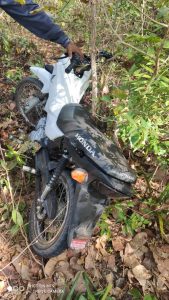 Na mesma barreira, por volta das 10h30, os policiais do Esquadrão Águia ainda deflagravam as ações de barreira na Rua da Ferrovia, quando avistaram um indivíduo estacionando o veículo às margens da via e adentrando no matagal. De imediato, os policiais realizaram diligências para localizar o suspeito, mas não foi possível capturá-lo. Foi realizada a identificação veicular e constatou-se que a motocicleta, cor vermelha, também possuía registro de roubo.