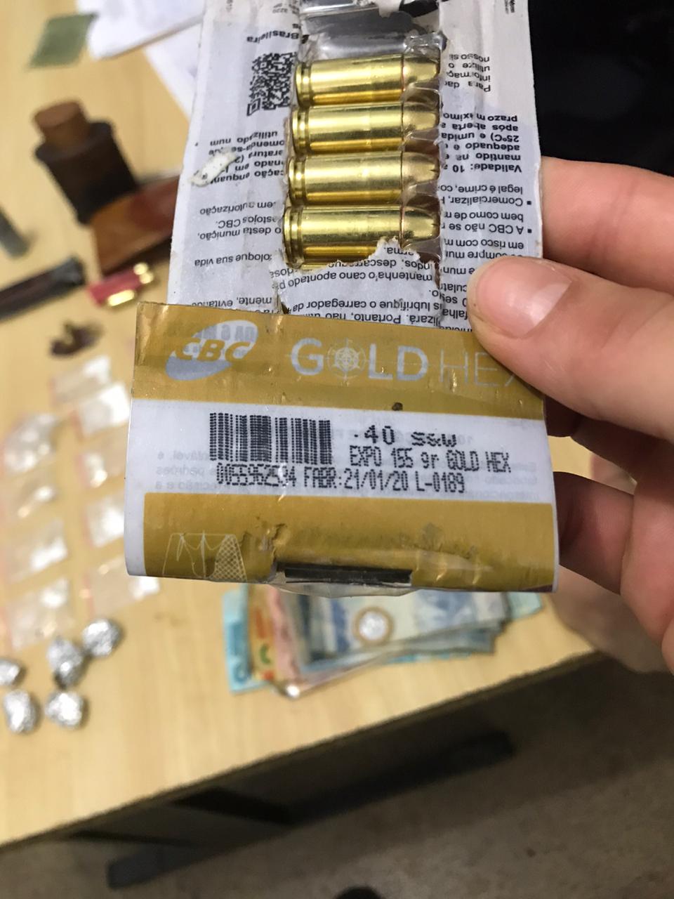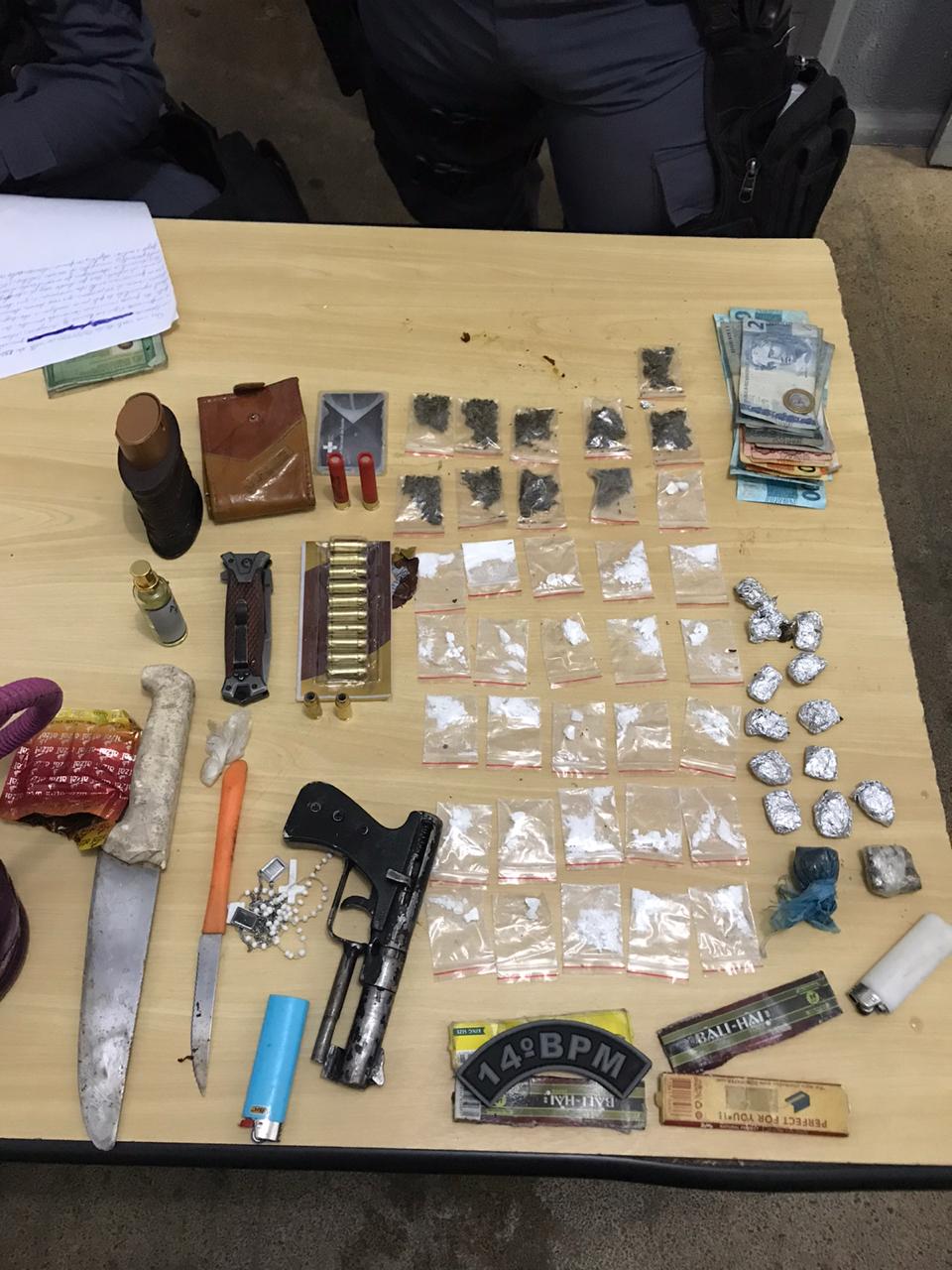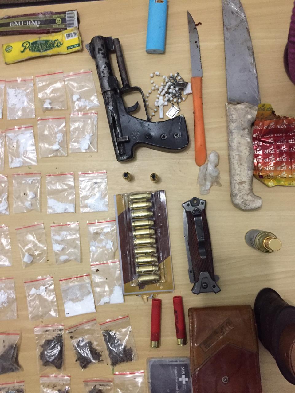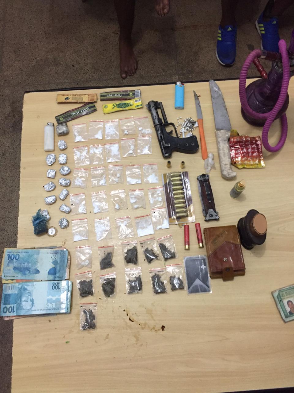 Com os suspeitos foram apreendidos, uma arma de fogo de fabricação caseira calibre 36, doze munições calibre 40, duas munições calibre. 36, duas armas branca, vinte e sete sachês de substância semelhante a cocaína, dez sachês de substância semelhante a maconha, quatorze porções de substância semelhante a maconha prensada e R$ 875,00 (oitocentos e setenta e cinco reais).