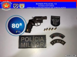Ao chegarem na rua Maruim, no bairro Campina, os suspeitos colidiram com um poste e abandonaram o veículo. Um dos suspeitos foi localizado, este por sua vez com um revólver calibre 38 sem numeração, contendo cinco munições.