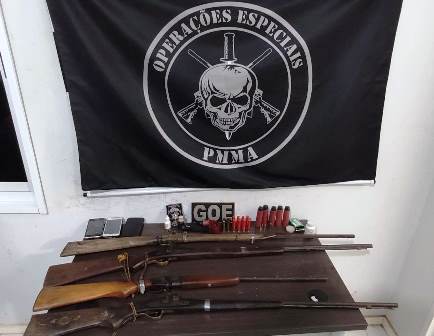 Policiais militares do Grupo de Operações Especiais (GOE), do 30º BPM, sediado em Buriticupu-MA, abordaram na noite de segunda-feira (9) quatro homens em duas motos na estrada vicinal que liga o município de Bom Jesus das Selvas-MA ao Rio Pindaré, com o quarteto foram encontrados quatro armas de fogo tipo espingarda, oito cartuchos calibre .36, quatro munições calibre .22, uma munição calibre .38, quatro buchas, quatro frascos de pólvora, duas bolsas com chumbinho, espoletas, celulares, uma moto Bros 150 e uma moto Pop 100 de placa OIY-8837. Diante dos fatos foi dado voz de prisão em flagrante delito pelo crime de porte ilegal de arma de fogo. Os suspeitos foram conduzidos e apresentados, sem lesões corporais, na Delegacia de Polícia Civil da Cidade de Bom Jesus das Selvas.