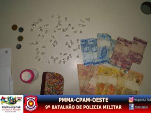 A Polícia Militar do Maranhão por intermédio da Equipe Raio Charlie, do 9º BPM, sediado em São Luis-MA, realizava patrulhamento, no inicio da noite de sábado (31), pelo bairro do Sacavém, quando avistou um indivíduo comprando algo em uma casa apontada como ponto de venda de drogas, com a aproximação dos policiais uma mulher tentou correr para dentro da residência, mas foi abordada e dentro da sua bolsa foram encontradas cinco petecas de uma substância semelhante a Crack, após uma revista minuciosa no local foram encontradas mais 55 petecas da mesma substancia e mais a quantia de R$196,50. Diante dos fatos a suspeita foi conduzida para o Plantão Policial do Bacanga, para medidas cabíveis e sem lesões corporais.