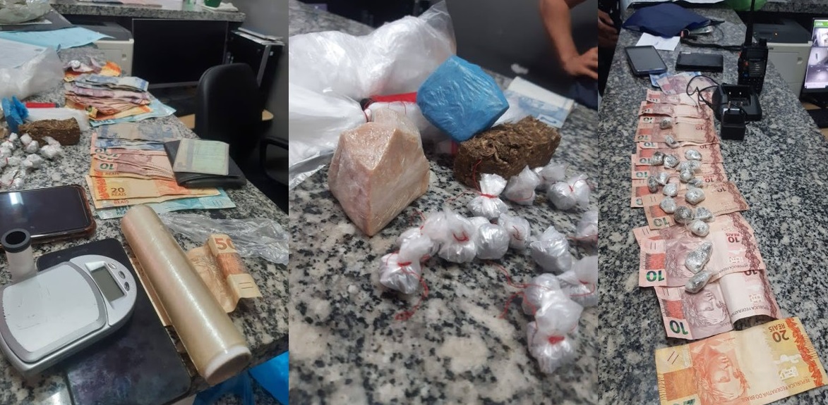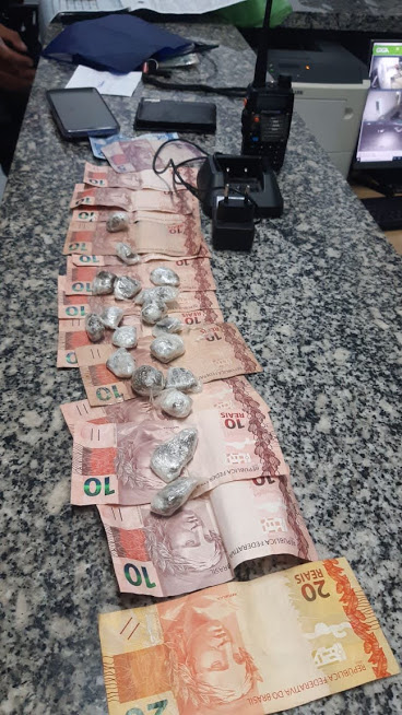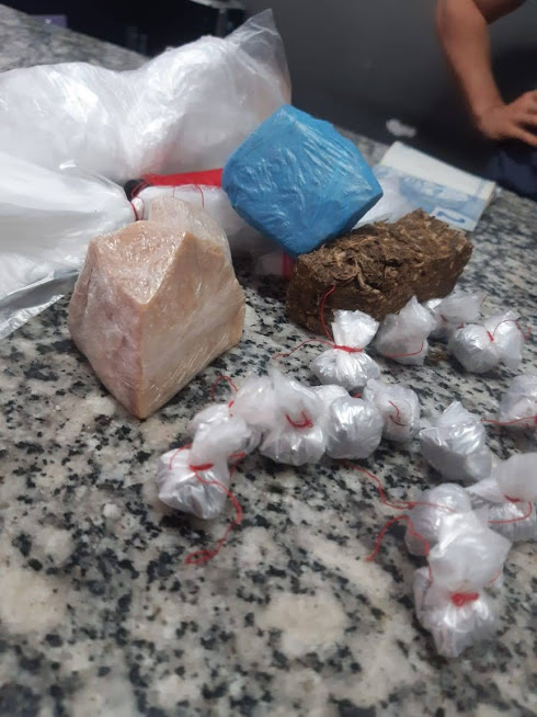 Com os conduzidos foram encontrados, dezessete papelotes de drogas, R$ 534,00 (quinhentos e trinte e quatro reais), várias porções de drogas diversas, dois tubos de linha, um relógio, uma televisão, cinco celulares, dois tabletes, um botijão, uma bicicleta, uma moto Brós e vários tubos de linha e plástico para embalagem da droga.