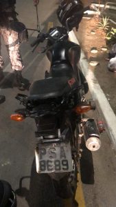 No mesmo dia, por volta das 22h, durante patrulhamento na Avenida Guajajaras, a guarnição avistou dois indivíduos em uma motocicleta, em atitude suspeita. De imediato, foi feito acompanhamento tático, na Avenida Jerônimo de Albuquerque, próximo ao Pop Center, na Cohab, os indivíduos foram abordados e na busca pessoal, foram encontrados um simulacro de arma de fogo, um revólver calibre 22 mm, com cinco munições intactas, um celular e a motocicleta de placa PSA-8689.