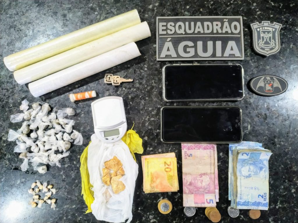 Por volta das 15h, os policiais receberam informações de um intenso tráfico de drogas na 1° Travessa da Avenida 02, Novo Angelim. Prontamente a guarnição realizou o cerco no local onde foram avistados dois indivíduos embalando substâncias semelhantes à Crack e Maconha. Durante a abordagem, doze pedras de substância semelhante à Crack, quarenta porções de substância semelhante à Maconha, três rolos de papel insulfilm, uma balança de precisão, dois celulares de cor verde da marca Motorola e R$ 279,10 reais em dinheiro foram encontrados.