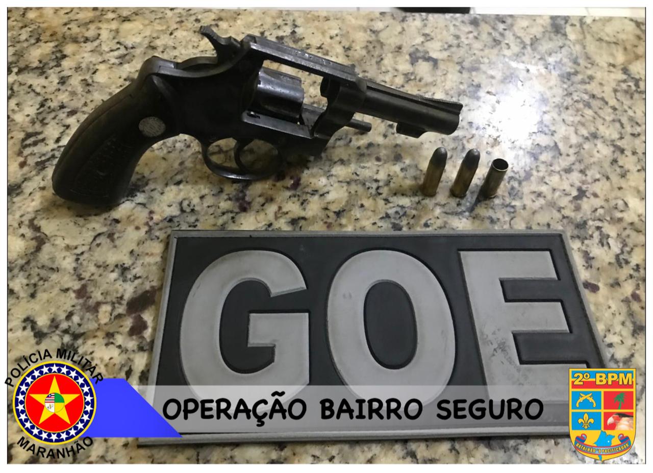 Durante a abordagem e revista pessoal foi apreendido um revólver calibre 32 mm, com duas munições intactas e uma deflagrada.