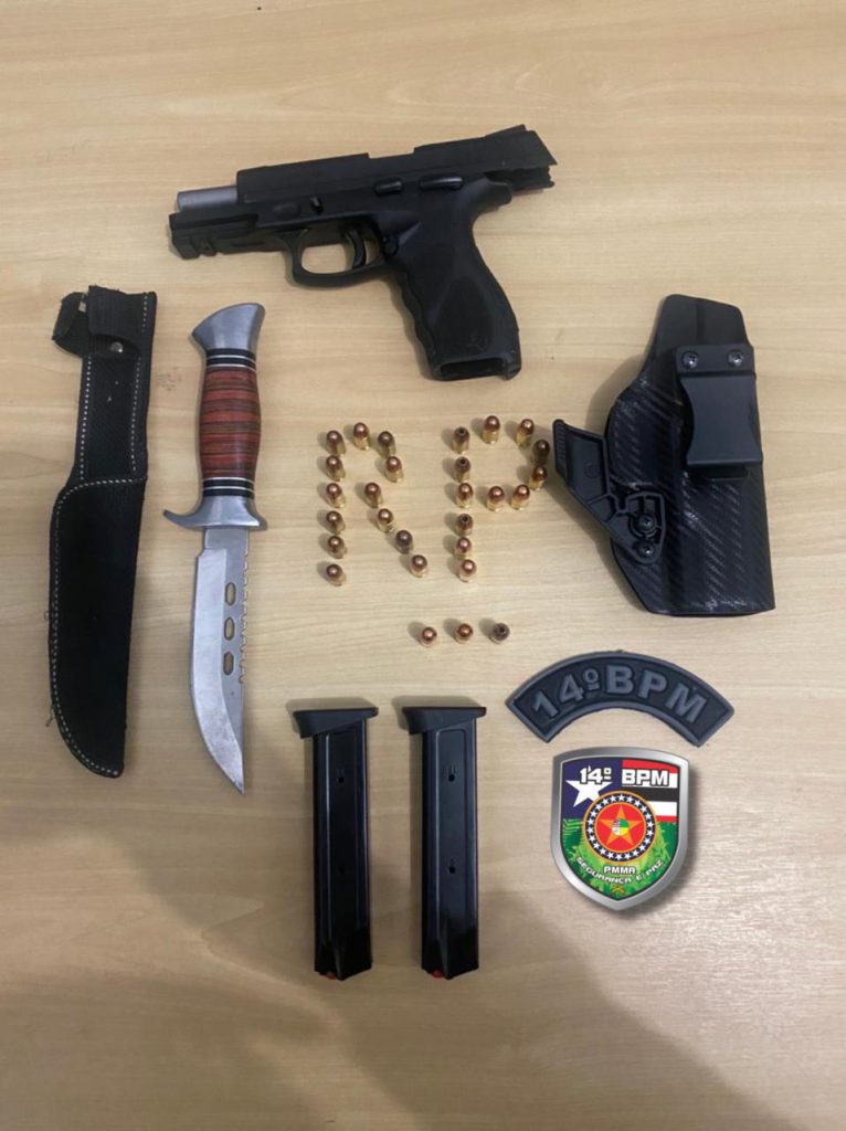 Os policiais efetuaram as abordagens e após a busca pessoal foi encontrado com um deles, uma pistola de calibre. 380 com dois carregadores contendo 29 munições e com o segundo, uma faca do tipo punhal.