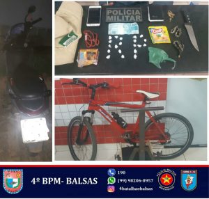 Os policiais do 4º Batalhão conduziram os dois suspeitos para a Delegacia de Polícia Civil, em Balsas-MA e os apresentaram juntamente com uma motocicleta, uma bicicleta, uma faca, um celular, R$ 100,00 e o material apreendido no momento da abordagem.