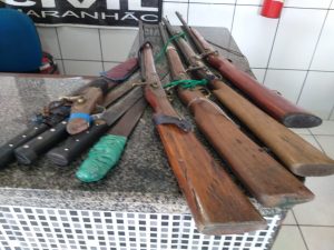 No início da tarde de sábado (10) a guarnição do 16º BPM, em Chapadinha-MA, realizava patrulhamento na zona rural de Urbano Santos-MA, quando foi informada que no povoado Guariba III havia duas motos roubadas, escondidas no interior de uma residência. Diante das informações, foi feito abordagem no local e durante as revistas foram localizadas as duas motos com o chassi e o motor adulterados, duas espingardas, uma garrucha e quatro armas brancas.