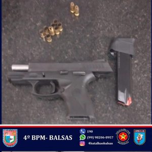 A guarnição da Rádio Patrulha do 4º Batalhão de Polícia Militar, em Balsas-MA, prendeu um homem por porte ilegal de arma de fogo. Os policiais receberam informações na madrugada de segunda-feira (14), que havia um homem efetuando disparos de arma de fogo em via pública e durante patrulhamento encontrou um homem em atitude suspeita, tentando esconder o armamento em um veículo. Com ele foi encontrado uma pistola calibre 380 com duas munições intactas e oito deflagradas. O suspeito foi encaminhado à Delegacia de Polícia Civil, onde foi conduzido e entregue juntamente com a arma apreendida.