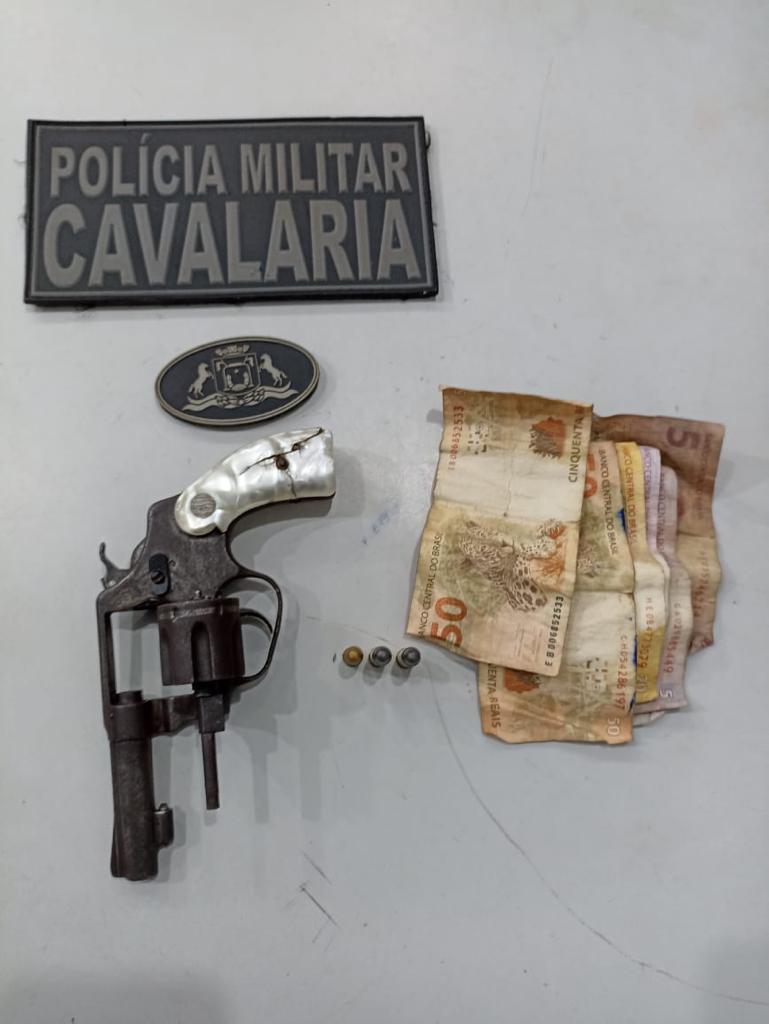 A guarnição procedeu com a revista pessoal, encontrando em posse do suspeito que estava na garupa um revólver calibre 32, com a numeração suprimida e com três munições intactas.