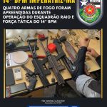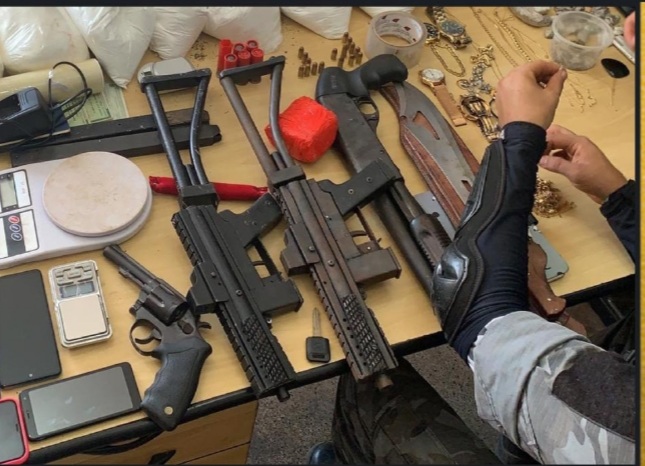 No local, foram encontradas quatro armas de fogo, sendo duas semi-metralhadoras sem numeração, uma espingarda de calibre 12 com a numeração suprimida e um revólver calibre 38.