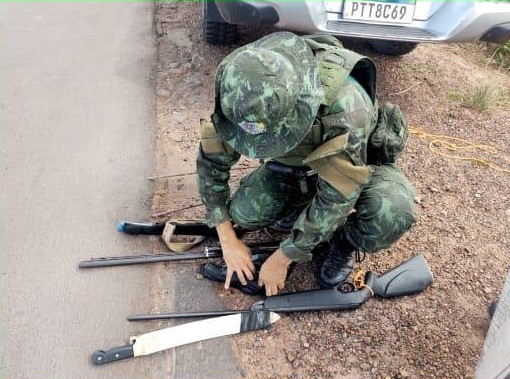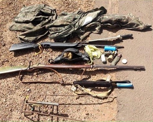 A guarnição deu a ordem para que eles parassem e eles empreenderam fuga, mas antes dispersaram duas espingardas bate bucha, duas espingardas calibre 22, um badogue (tipo de atiradeira), e cinco munições calibre 22 intactas.