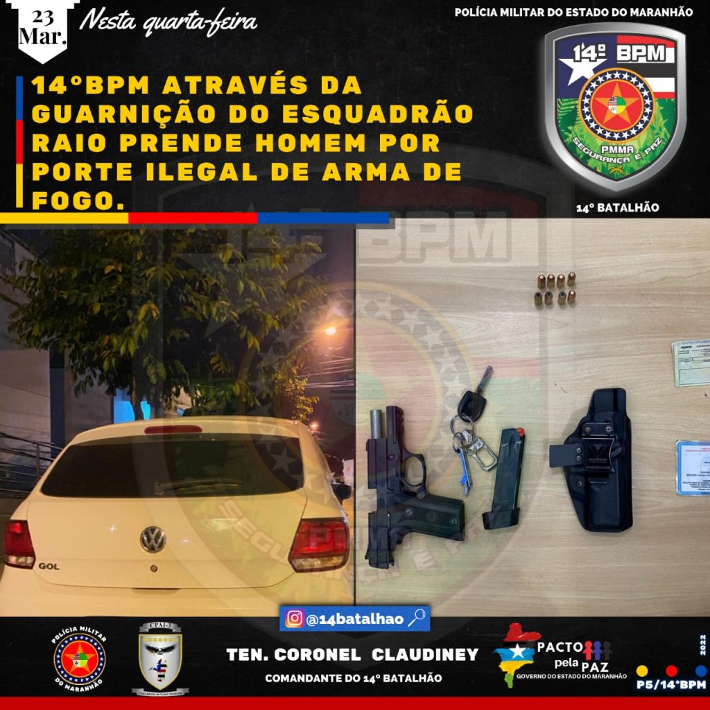 Nesta quarta-feira (23), por volta das 18:00hs, a guarnição do Esquadrão Raio do 14º BPM realizava patrulhamento ostensivo e preventivo no bairro Parque Alvorada I, quando avistou o veículo gol branco, cujo condutor apresentou atitude suspeita ao visualizar os militares. Foi feito realizado o acompanhamento tático e posteriormente a abordagem. Durante a busca veicular, foi encontrada uma (1) arma de fogo municiada, Pistola PT 940 TAURUS cal. 40 S&W. O conduzido apresentou o Certificado de Registro da Arma, porém não apresentou o documento necessário para portar o armamento de forma legal. Desta forma o mesmo foi detido e conduzido à Delegacia de Polícia Civil para as devidas providências legais.