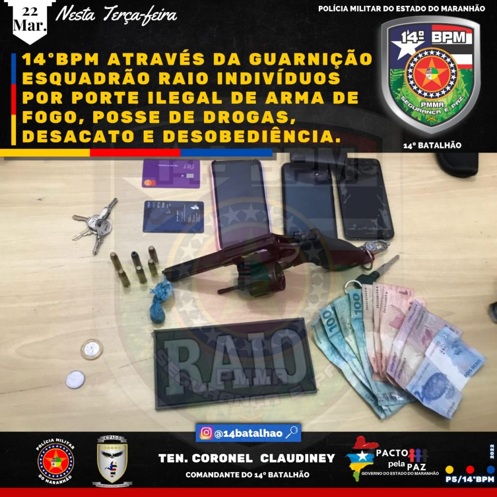 Na busca pessoal foi encontrado ainda uma (1) porção de substância análoga à maconha “no bolso do “M”. Indagado sobre a arma encontrada, “M” afirmou ser para sua proteção, que o mesmo tinha comprado por R$3.000 mil reais, de outro faccionado e que este já teria falecido em São Luís em confronto com a Polícia Civil. Ao consultar o número de série do revólver, foi constatado que o mesmo pertence a uma empresa de vigilância, “Real Segurança”, que foi tomado de assalto no dia 21 de julho de 2021 em um cartório da Cidade de Imperatriz.