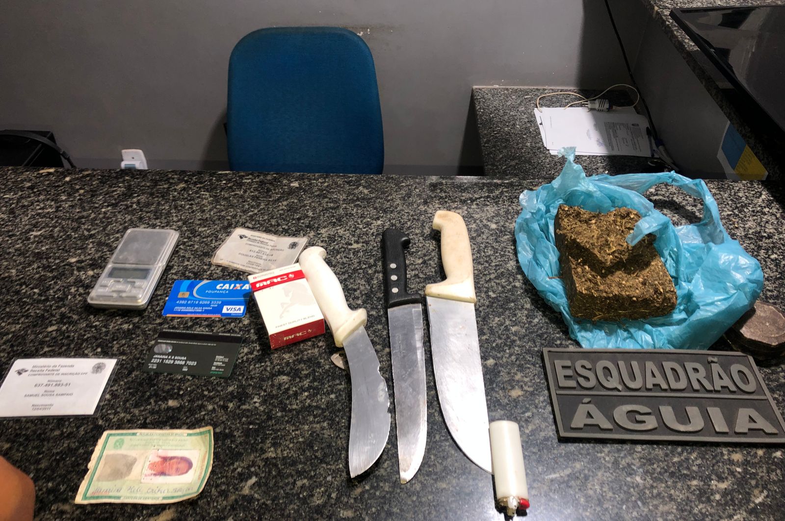 Ao entrarem nessa outra casa os policiais encontraram 324 g de substância similar a maconha, uma balança de precisão, facas, tesouras com picotes ao chão, e barras de substância similar a maconha. No local também foram encontrados documentos pessoais de uma suspeita conhecida na região pela pratica de tráfico de drogas. Todos os produtos foram apresentados na delegacia de polícia para medidas cabíveis.