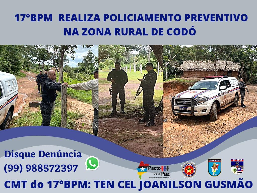 Uma das diretrizes do Comando do 17°BPM é realizar o patrulhamento na zona rural do município de Codó cujo objetivo do policiamento é o contato e a aproximação com os moradores e comerciantes da Zona Rural, repassando dicas de segurança e demais métodos preventivos, para prevenir e combater ações delituosas na área rural.