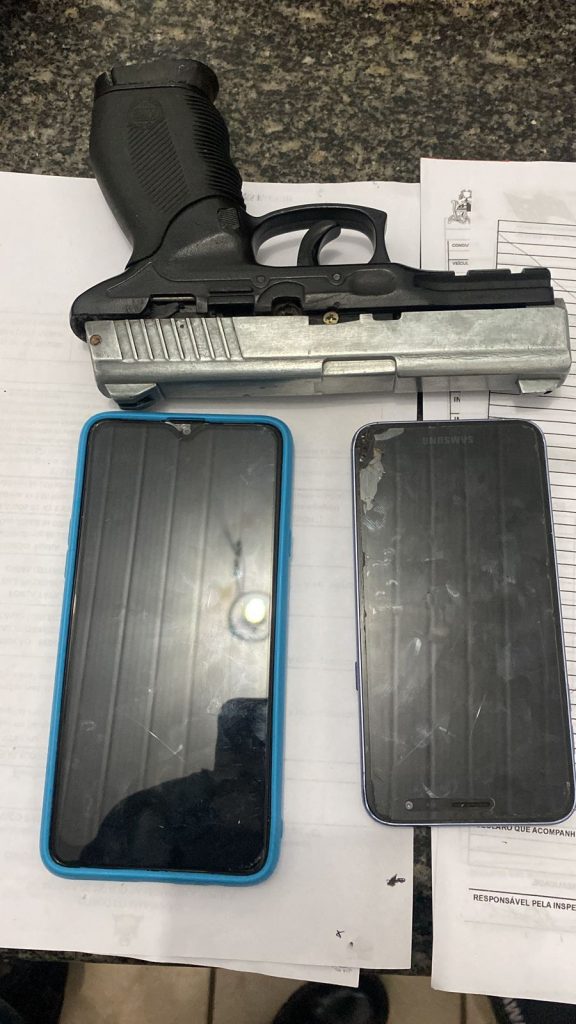 Com o indivíduo foi encontrado um simulacro de arma de fogo e dois celulares.O suspeito foi conduzido à Delegacia Regional de Pedreiras. No local, o homem foi identificado por uma mulher que sofreu um assalto momentos antes.