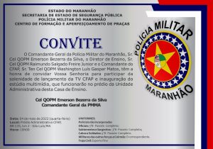 O DIRETOR DE ENSINO DA POLÍCIA MILITAR DO MARANHÃO, no uso de suas atribuições legais, têm a honra que convidar todos os integrantes da honrosa PMMA, em especial os Alunos dos Cursos Regulares (CAS, CEFS e CEFC/2022.1) e do Curso de Nivelamento Técnico Profissional (CNTP), para participarem da solenidade de lançamento da TV CFAP e inauguração do estúdio multimídia.