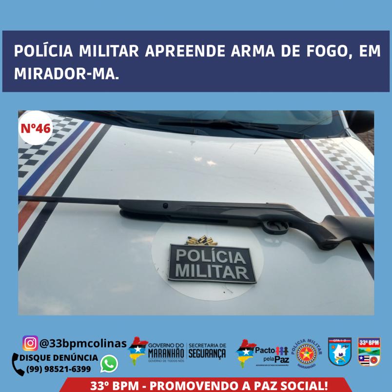 Em duas ações distintas a Polícia Militar do Maranhão, por meio do 33º Batalhão apreendeu mais duas armas de fogo na sua área de atuação. As ações aconteceram nesta segunda-feira (30), nas cidades de Colinas e Mirador (MA), durante operações de prevenção e combate à criminalidade e resultaram na prisão de duas pessoas por porte ilegal de arma de fogo.