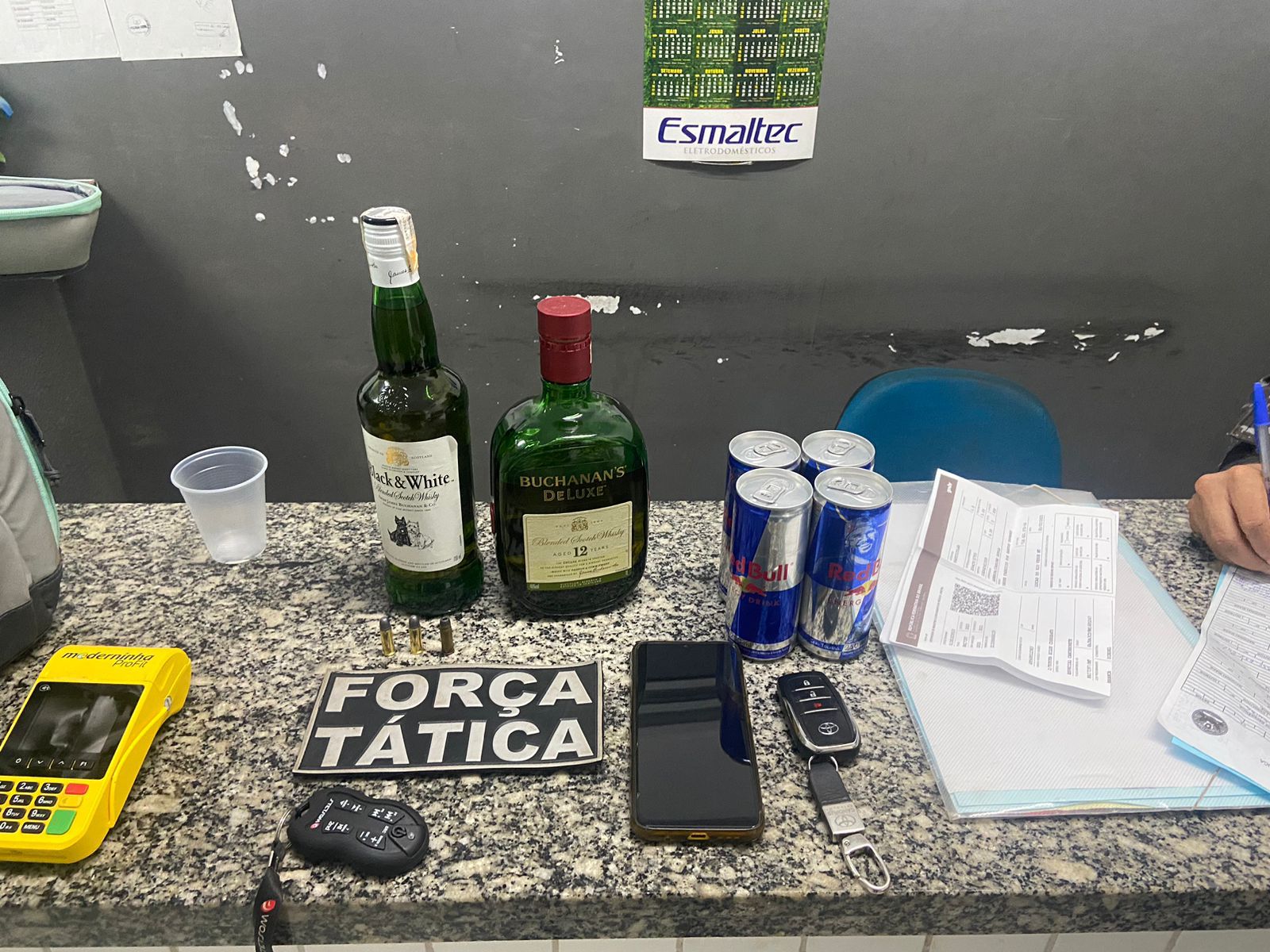 Com o suspeito foram encontradas 03 munições calibre 32 intactas. No veículo, que também foi apreendido, foram encontradas garrafas de bebida alcoólica e energéticos.