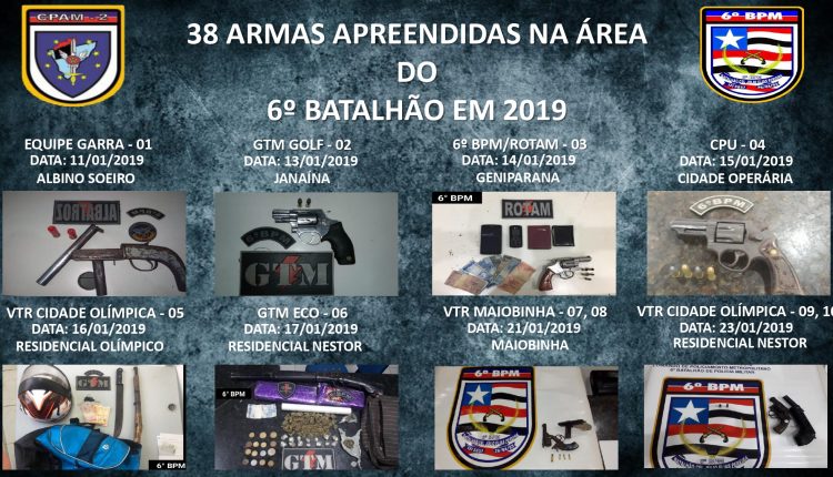 Segundo informações do comandante da unidade, major Marcelo, de janeiro de 2019 até 10 de março de 2019, já foram apreendidas 38 armas de fogo. Segundo o oficial, as armas apreendidas são resultado de liderança, trabalho e comprometimento de toda a tropa do 6º BPM. “Continuaremos trabalhando diuturnamente, garantindo a ordem pública o direito de ir e vir de cada cidadão e o combate contra a criminalidade na área do 6º BPM”.