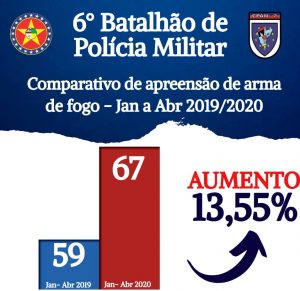O 6° Batalhão de Polícia Militar, importante unidade policial da capital , subordinada ao comando de policiamento Metropolitano 2 , CPAM-2, fechou os primeiros quatro meses de 2020 com 67 armas de fogo tiradas de circulação O que representa um aumento de 13,55 % na, produtividade se comparado com o mesmo período do ano passado. Esses números expressivos de apreensões de armas se traduz em mais prevenção e segurança a todas as comunidades na qual está sob a jurisdição deste batalhão.