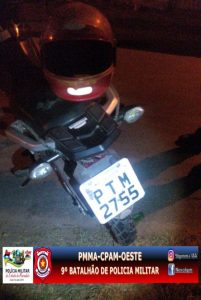 A equipe Raio do 9° BPM, sediado em São Luis-MA, localizou na noite de sábado (17), uma moto Honda CG, de placa PTM-2755, após receber informações via CIOPS que uma moto estaria escondida em um matagal próximo a Rua 2, do Bairro do Anil.