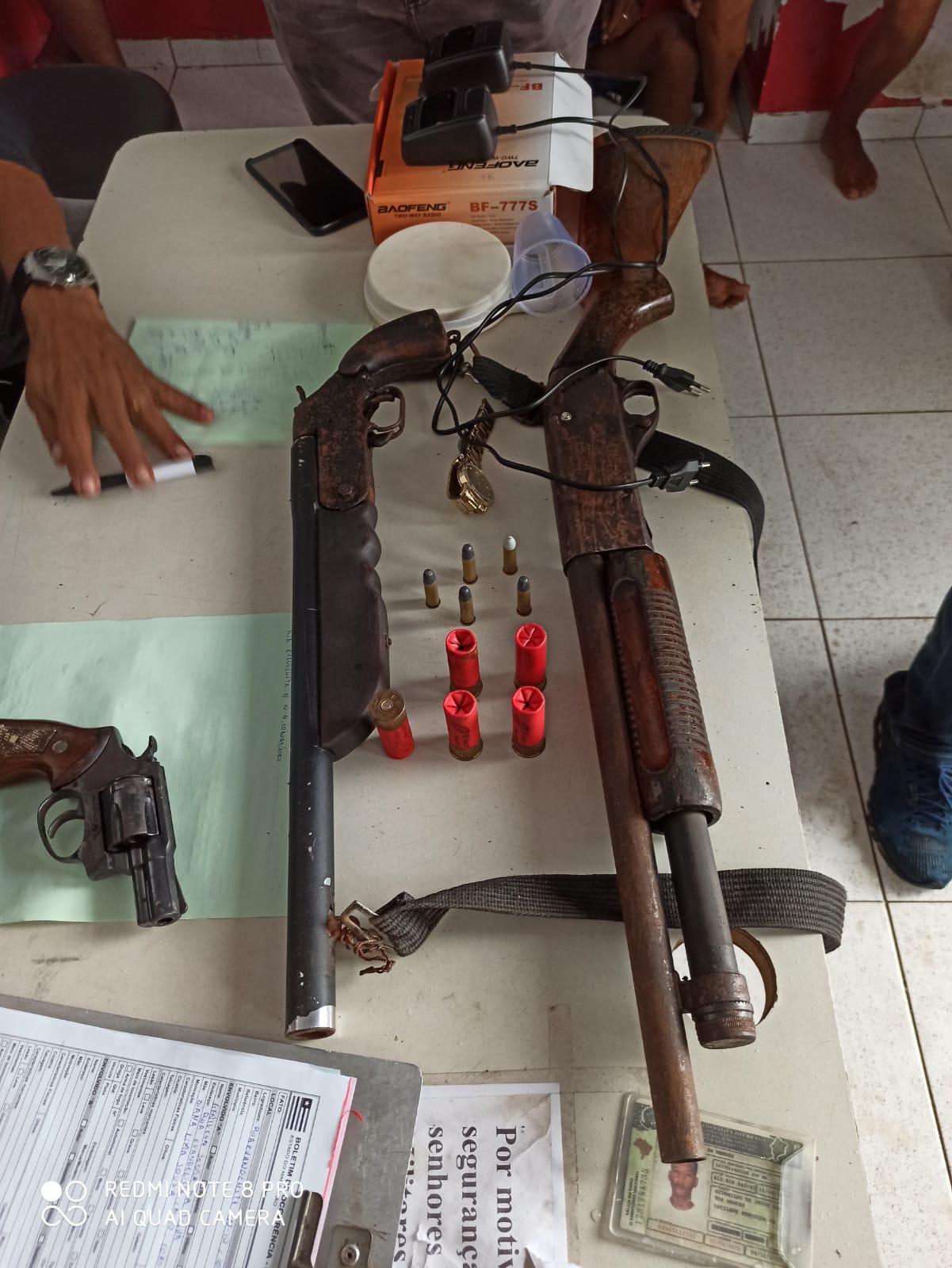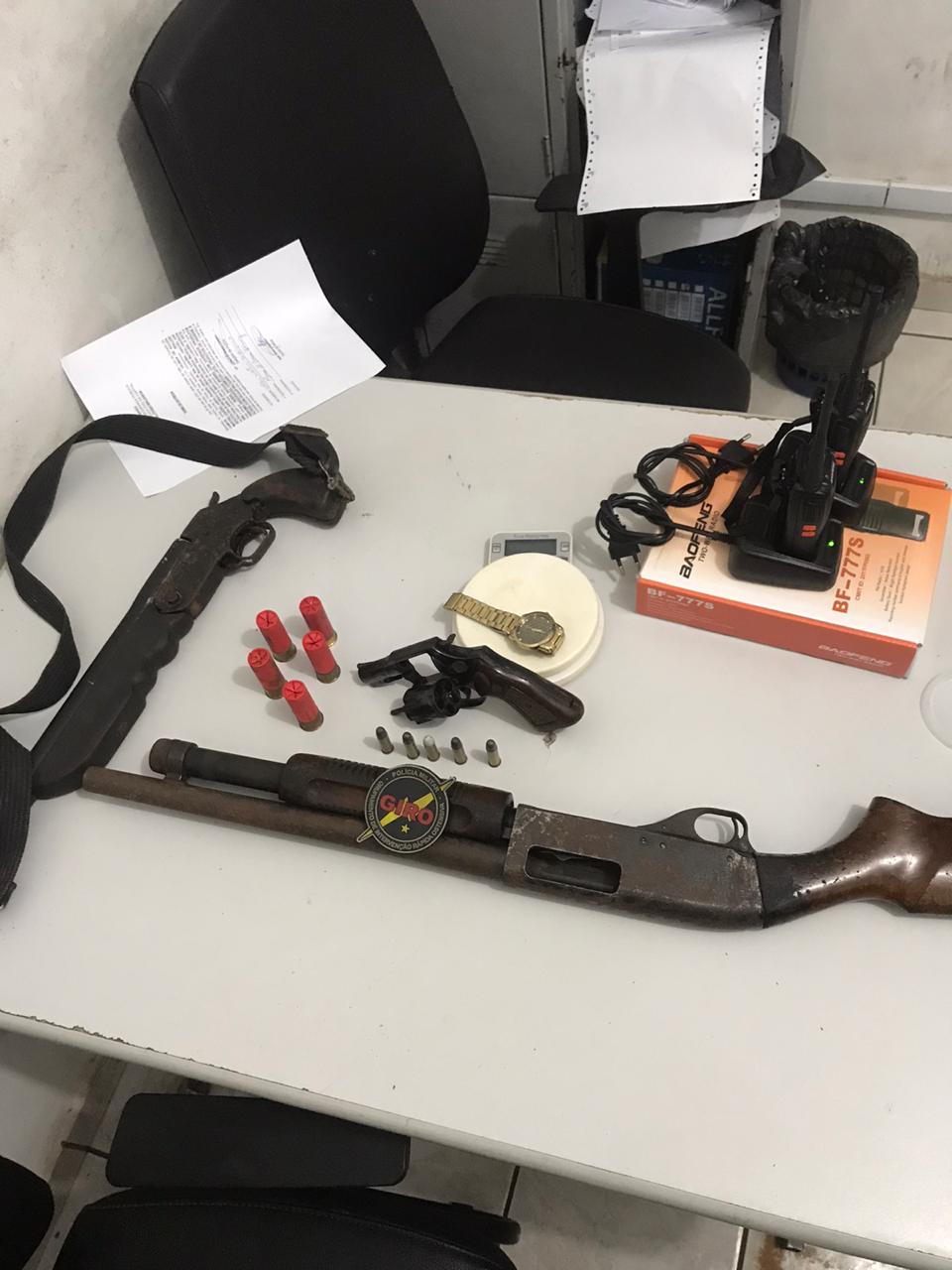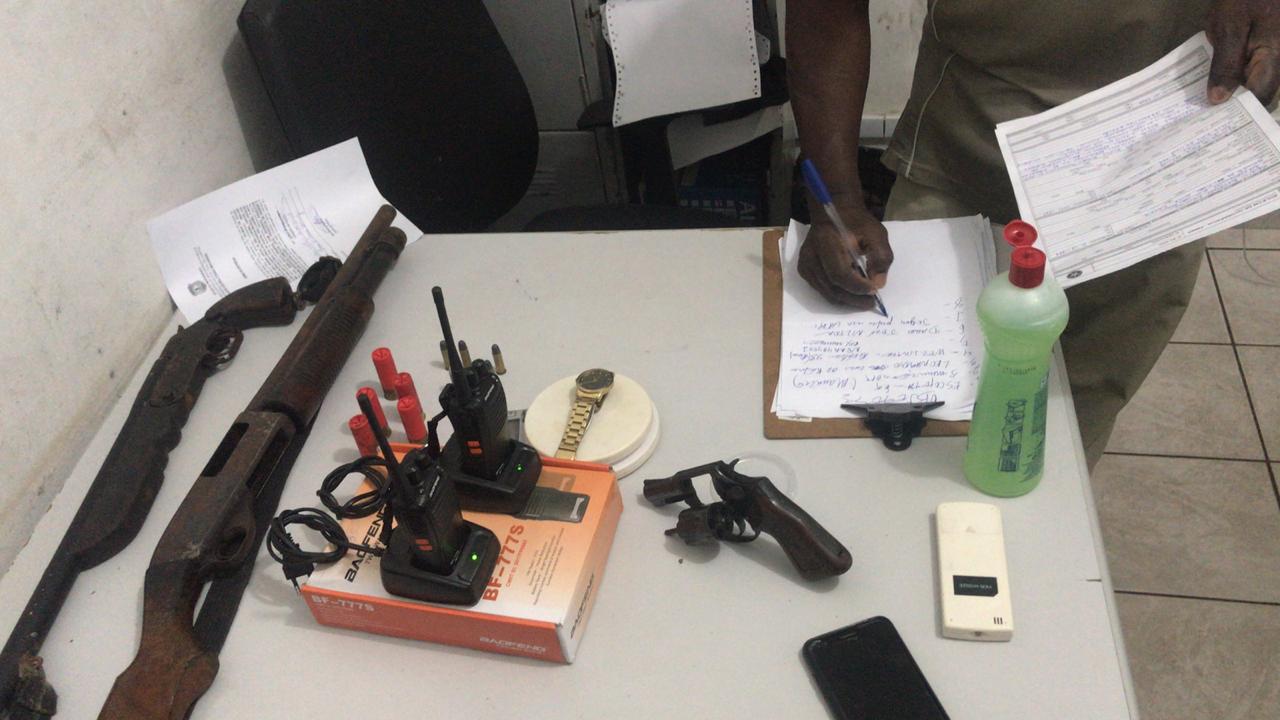 Materiais apreendidos: 01 (uma) escopeta calibre 12 de repetição; 01 escopeta calibre 12 simples; 01(um) revólver calibre 38; 06 munições calibre 12; 05 munições calibre 38 intactas; 02 (dois) rádios de comunicação.
