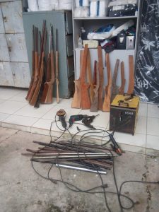 Após receberem uma denúncia informando que um homem fabricava armas de fogo no bairro Areal, os militares do Grupo de Serviço Avançado (GSA) do 16º BPM foram verificar a informação e encontraram o suspeito e o material utilizado na fabricação das armas: 10 espingardas bate bucha; uma espingarda cartucheira cal. 32; 20 canos; uma máquina de solda; duas furadeiras; 10 coronhas e 18 suportes de espoleta. Constatada a veracidade da denúncia, o suspeito e o material apreendidos foram apresentados na DPC de chapadinha para as providências cabíveis.