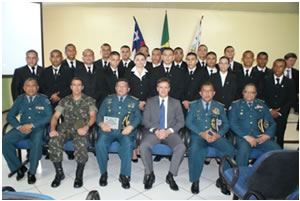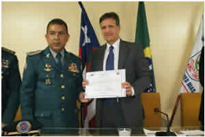 | Coronel Franklin entregando certificado ao Secretário Aluisio Mendes pela palestra proferida ao CFO | Coronel Flávio filho do coronel Demétrio nome da Turma recebeu placa das mãos do tenente coronel Jesus |