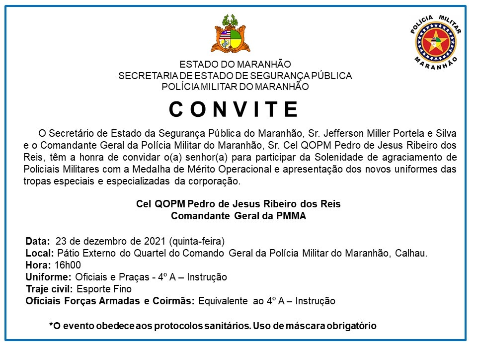Convite Formatura de entrega de Medalha “Mérito Operacional” e apresentação dos novos uniformes das tropas especializadas da PMMA