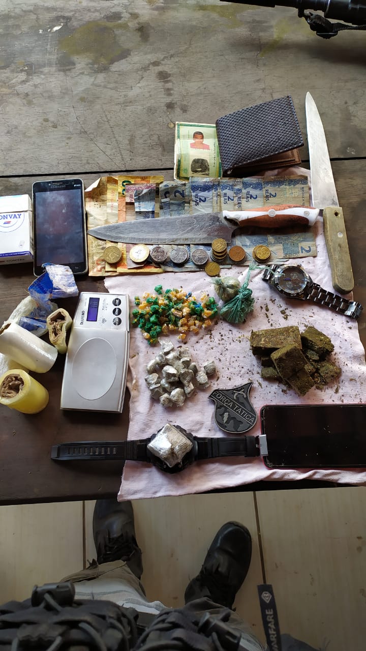 No local foram encontrados, 24 papelotes de substância semelhante à maconha, 77 gramas; 85 pedras de substância semelhante ao crack  85, 33 gramas, uma balança, (um) celular, a quantia de R$141,80 e filme plástico pra embalar drogas. Duas testemunhas foram apresentadas na delegacia e  dois indivíduos foram presos pelo de crime de tráfico de entorpecentes.